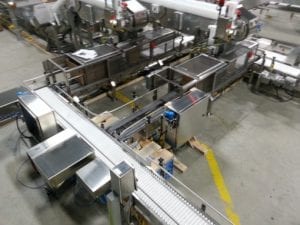 The Case Handling System Module receives empty cases from the case former and collates them between Lane E and Lane F based on demand. Cases are presented to the loading zones via multiple pneumatic devices.